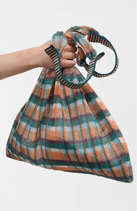 Triangle mesh bag with a large mesh weave.